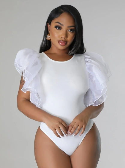 Elevate your wardrobe with this stunning bodysuit featuring delicate organza sleeves that add an instant touch of elegance and movement. The sheer tulle construction creates a romantic, ethereal aesthetic while the fitted bodysuit silhouette offers a flattering, streamlined look.